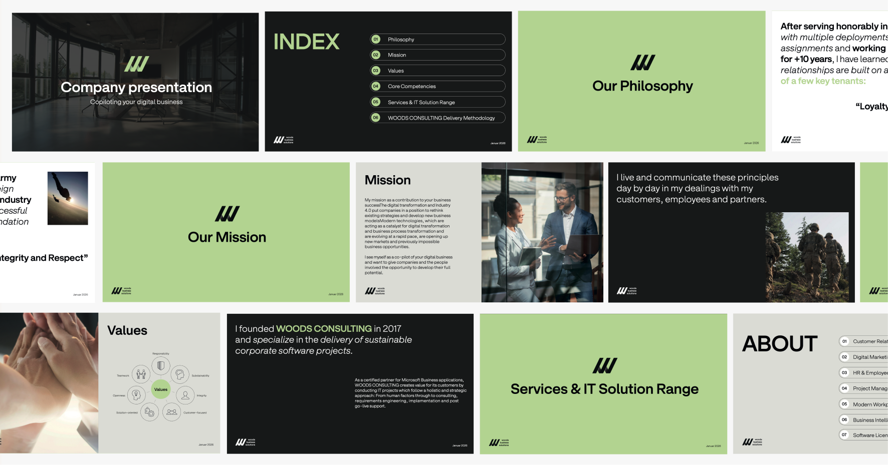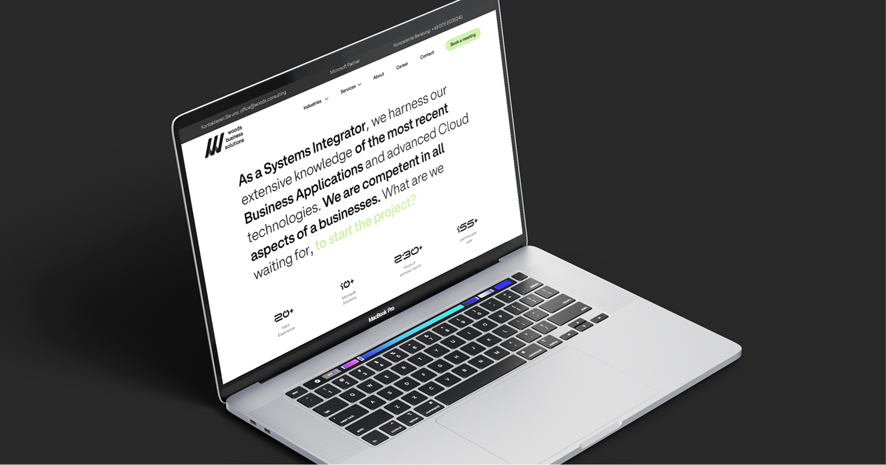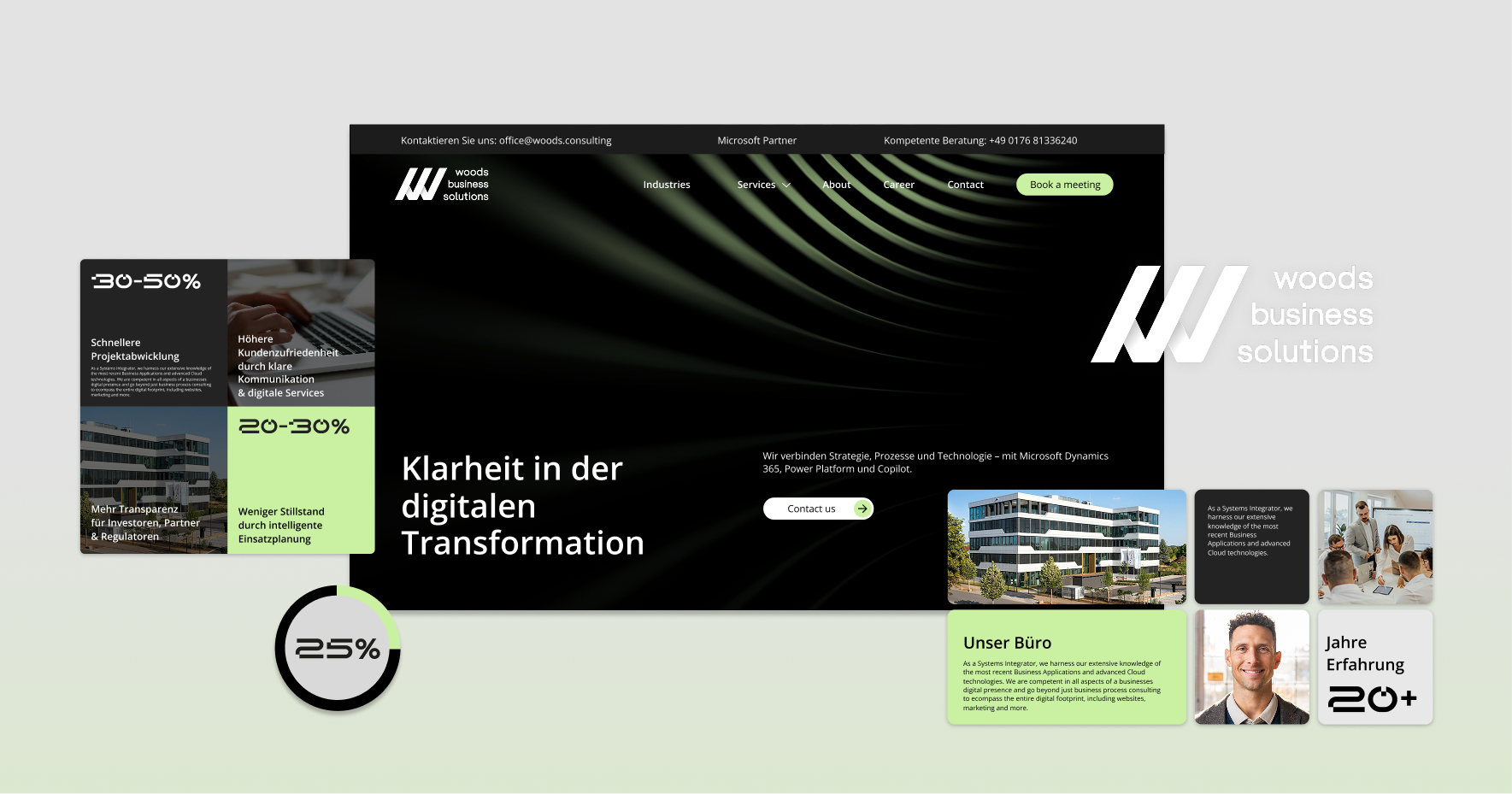 Für woods business solutions haben wir ein umfassendes Rebranding sowie eine strategische Neupositionierung der Marke entwickelt. Ausgangspunkt war ein intensiver Markenworkshop, dessen Auswertung die Grundlage für die neue Markenidentität bildete. Darauf aufbauend entstanden eine starke Bildmarke, eine eigenständige Farbwelt, eine konsistente Corporate Identity sowie Geschäftsausstattung und Präsentationsvorlagen. Ergänzend dazu haben wir ein individuelles Webdesign konzipiert, das die neue Markenposition visuell transportiert. Der gestalterische Ansatz verbindet zeitlose, moderne und technische Elemente mit einer mutigen, ausdrucksstarken Bildsprache. Eine markante Signalfarbe in Limegrün zieht sich durch das gesamte Designsystem und sorgt für Wiedererkennbarkeit. Großzügige Flächen, dynamische Grafiken und eine kräftige Typografie verleihen der Marke Klarheit, Präsenz und einen unverwechselbaren Charakter.